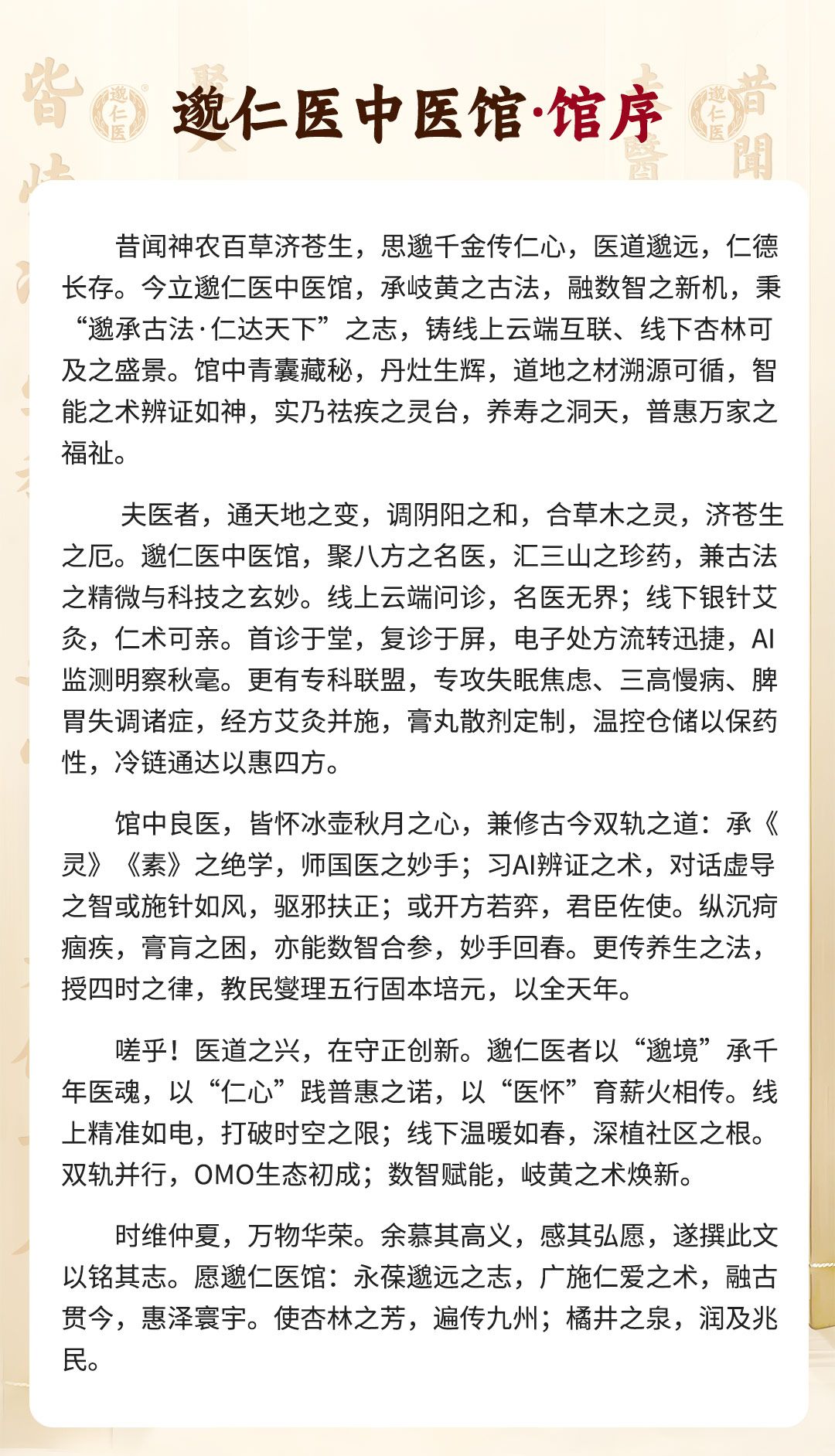 使命:以“线下首诊”是根基,以“线上复诊”为延伸,致力于打造“古法数智融合,疗愈温暖可及”的新中医生态。通过数字化赋能,让传统中医馆焕发新生,让百姓享受“身边良医坐诊,服务触手可及”的智慧健康生活。